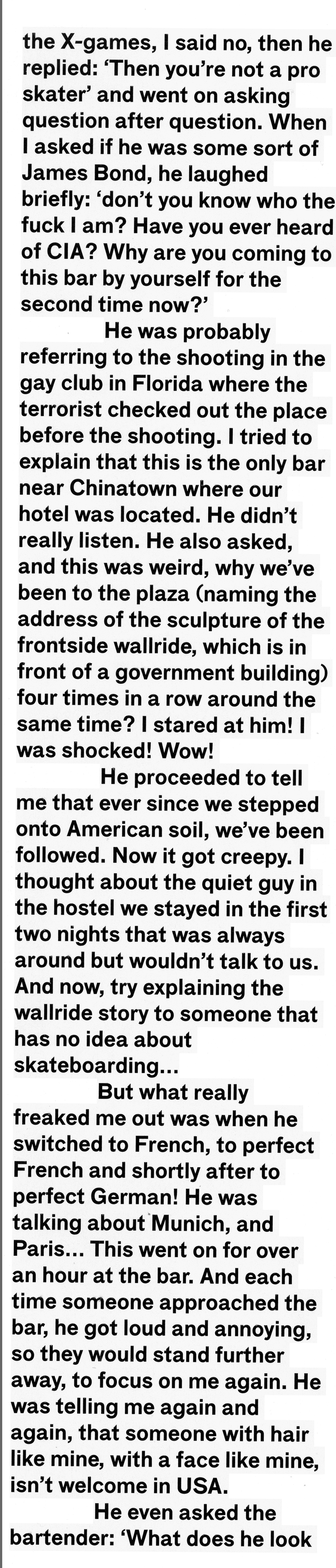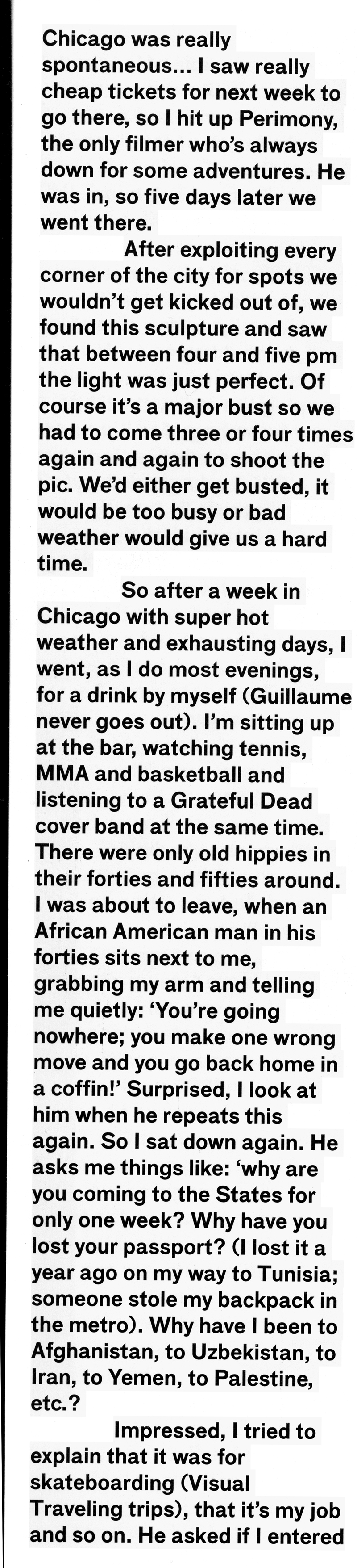 Free skate mag, né des cendre de KingPin, a publié dans son dernier numéro quelques anecdotes de MicMac, pour les intimes. Voici une des bonnes feuilles comme on dit dans le jargon. Une histoire surréaliste, très actuelle, et qui ne peut-être inventée. Ça se passe pendant un voyage à Chicago, avec le vidéaste Guillaume Perimony dans les parages. Le reste, c’est définitivement dans l’Histoire, gravé au Panthéon du skateboard. - SC
