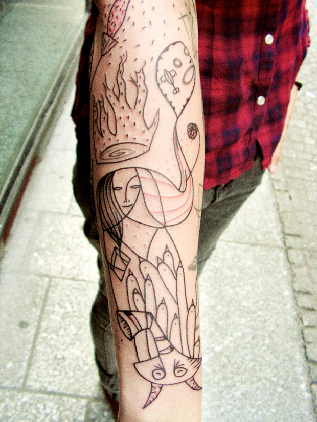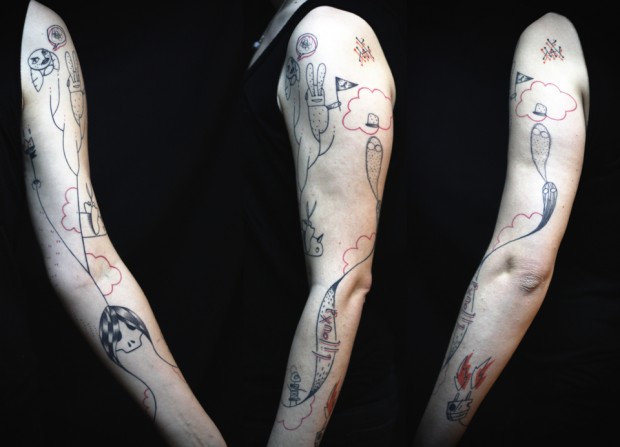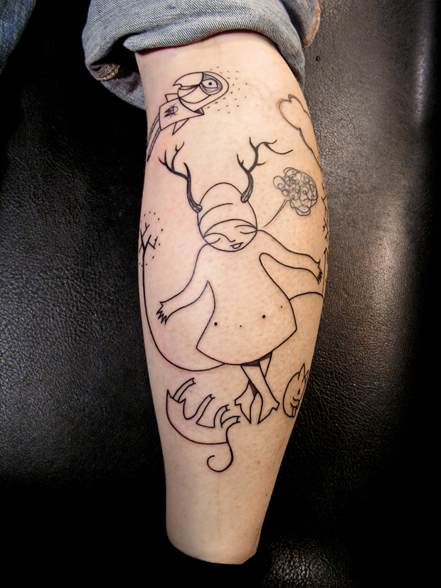 Il y a de très nombreux artistes, des illustrateurs, qui me touchent plus que bon nombre de tatoueurs. De Camillia Engman à Nate Williams en passant par Ludovic Debeurme ou Dave McKean… Ce sont des gens qui ne sont pas du tout dans le tatouage mais qui me touchent énormément. J’ai toujours eu ce goût pour les arts plastiques. Un type comme Bernard Venet, qui fait ces immenses torsions de métal, quand je vois ses croquis, je trouve qu’il y a une recherche graphique qui va au delà de l’image joliment dessinée : c’est une émotion. Après, en tant que tatoueur je ne suis pas dans l’art, je suis dans l’artisanat : je suis là pour répondre à la demande d’une personne. Et j’apporte mes moyens technique, mon bagage culturel.