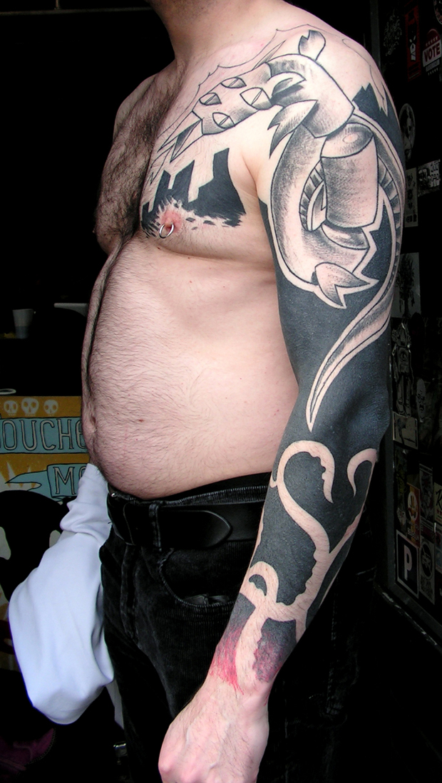 A mon avis ça vient surtout du fait qu’on est pas mal à sortir d’école d’art, donc a avoir eu un parcours différent du tatoueur à l’ancienne, qui ouvre sa boutique au coin de la rue et qui y reste, et qui répond juste à la demande locale. Ce n’est pas du tout péjoratif, c’est une approche différente, faire du flash (les dessins tout fait qu’on trouve souvent sur les murs des boutiques de tattoo -ndlr) cela correspond aussi à une clientèle. Comme tout le monde j’ai commencé avec les flashs dans les magazine de biker américain, l’imagerie aigle, tête de mort. J’ai passé des heures a essayer des les recopier. Mais culturellement je ne venais pas de là, je venais plus de l’illustration, la peinture. Et la musique bien entendu, avec les flyers, les photocopies, les à plats de noir pour faire les affiches ou les pochettes de disques. Du coup j’ai aussi cette approche pour un tattoo, j’essaye de garder un coté lisible, épuré, construit d’une manière telle qu’on puisse comprendre de suite le motif. Je suis plus attiré par la lisibilité que par la prouesse technique. Si je vois un dessin de Magritte, Topor, Folon, je serai plus touché par la poésie qui s’en dégage que par certain tatoueur hyper réalistes mais dont les tattoo sont illisibles à 2 mètres. Même si je reconnais la qualité du travail, de par ma culture ça n’est pas ce qui me touche en premier.